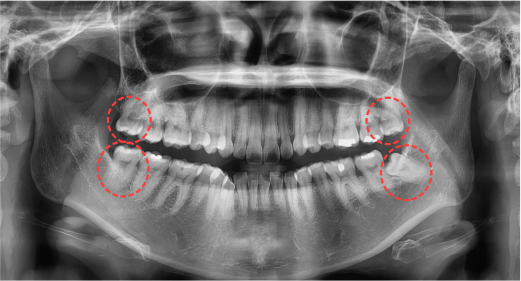 사랑니에 문제가 있는데도 불구하고 그대로 둘 경우, 그 앞의 건강한 어금니(제2 대구치)까지 충치에 이환되는 경우가 많습니다.